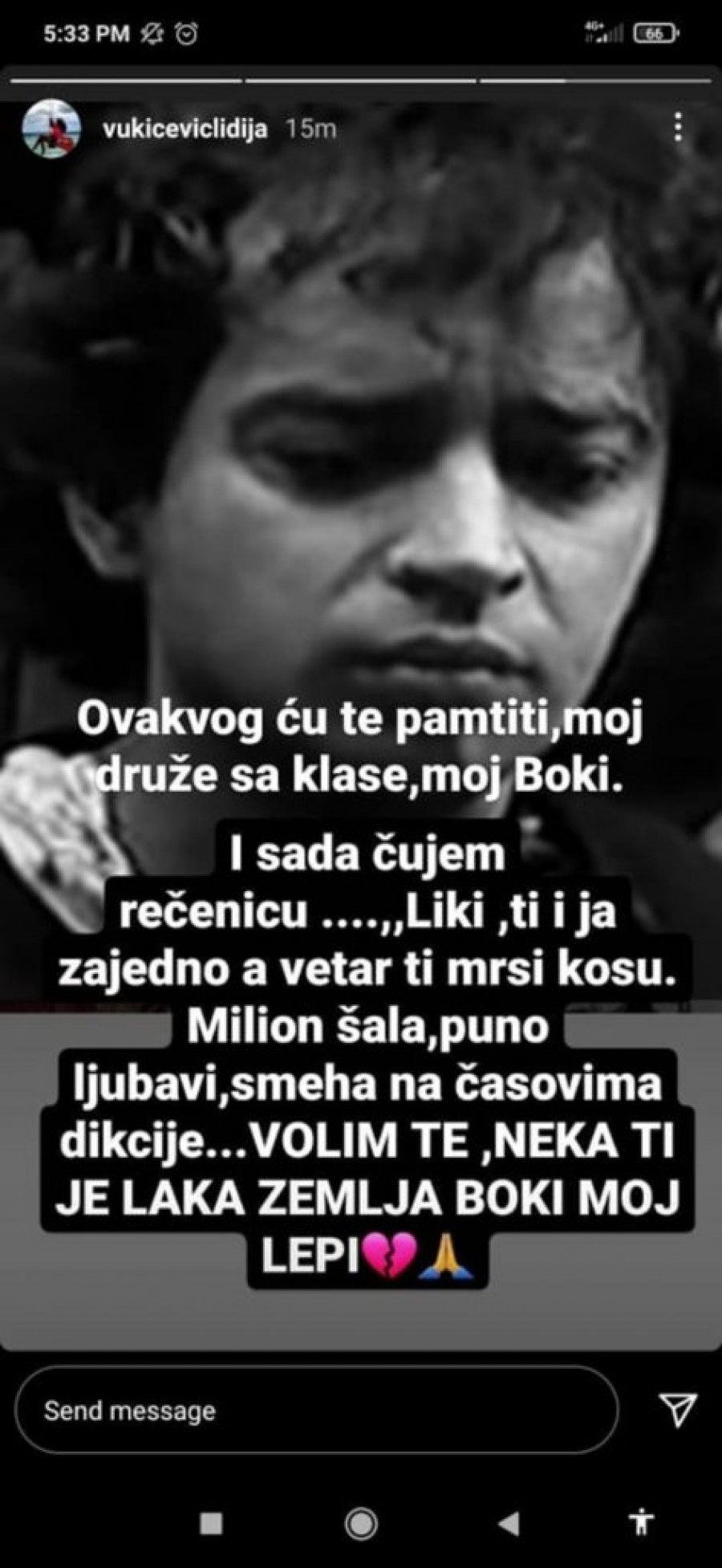 Foto: instagram.com/vukiceviclidija-Ovakovog ću te pamtiti, moj druže sa klase, moj Boki. I sada čujem rečenicu: "Liki, ti i ja zajedno,a vetar ti mrsi kosu". Milion šala, puno ljubavi, smeha na časovima dikcije... Volim te, neka ti je laka zemlja, Boki moj lepi", napisala je Lidija na Instagramu uz njegovnu crno - belo fotografiju.