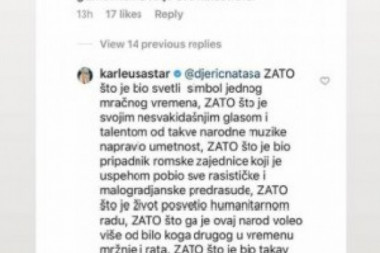 - Zato što je bio svetli simbol jednog mračnog vremena, zato što je svojim nesvakidašnjim glasom i talentom od takve narodne muzike napravio umetnost, zato što je bio pripadnik romske zajednice koji je uspehom pobio sve rasističke i malograđanske predrasude, zato što je život posvetio humanitarnom radu, zato što ga je ovaj narod voleo više od bilo koga drugog u vremenu mržnje i rata. Zato što je bio takav pevač-da bi mu svako od onih koje si navela da su više vredni stegao ruku. Zato što je odrastao u domu, a umro kao legenda koja je ostavila trag na Srbiju i u srcima ovog naroda. E, zato je zaslužio.