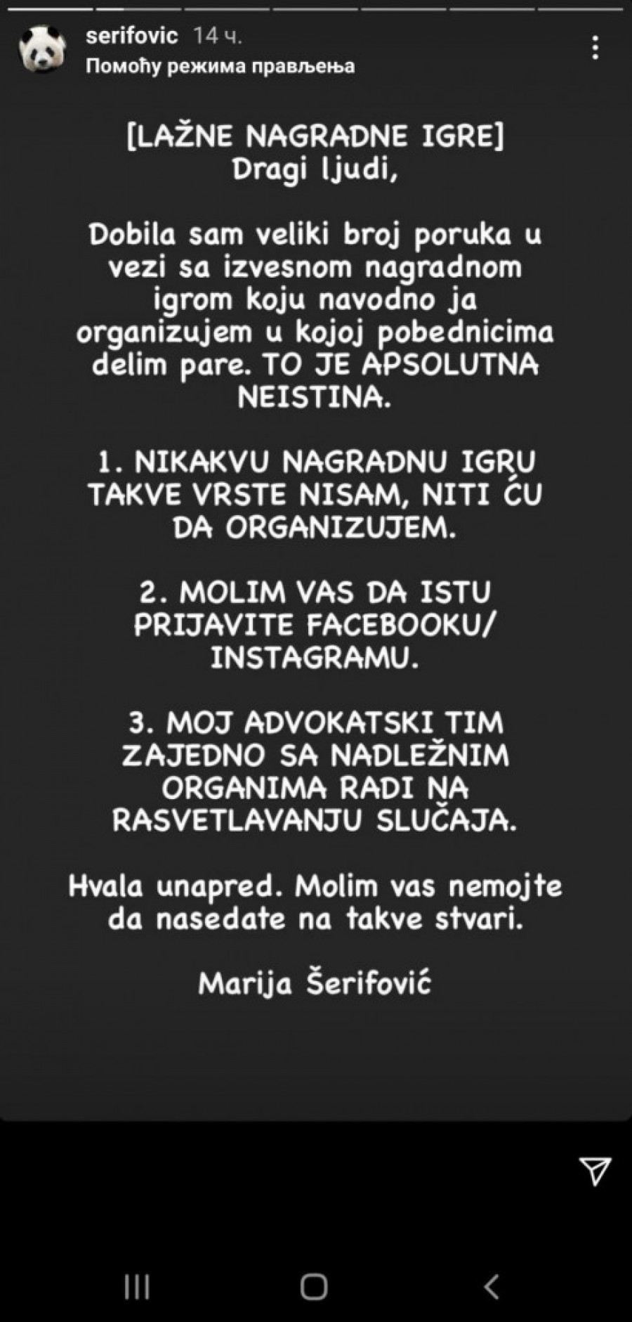 - Dragi ljudi, dobila sam veliki broj poruka u vezi sa izvesnom nagradnom igrom koju navodno ja organizujem, u kojoj pobednicima delim pare. To je apsolutna neistina. Nikakvu nagradnu igru takve vrste nisam, niti ću da organizujem. Molim vas da istu prijavite Fejsbuku/Instagramu. Moj advokatski tim zajedno sa nadležnim organima radi na rasvetljavanju slučaja. Hvala unapred. Molim vas nemojte da nasedate na takve stvari - piše u Marijinoj objavi.