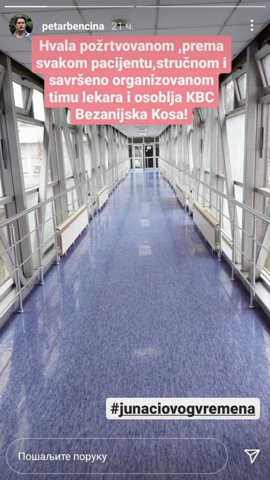 Foto: instagram.com/petar.bencinaBenčina je objavio fotografiju iz bolničkog hodnika, gde se fotografisao na putu ka kući, s obzirom na to da je otpušten na kućno lečenje.