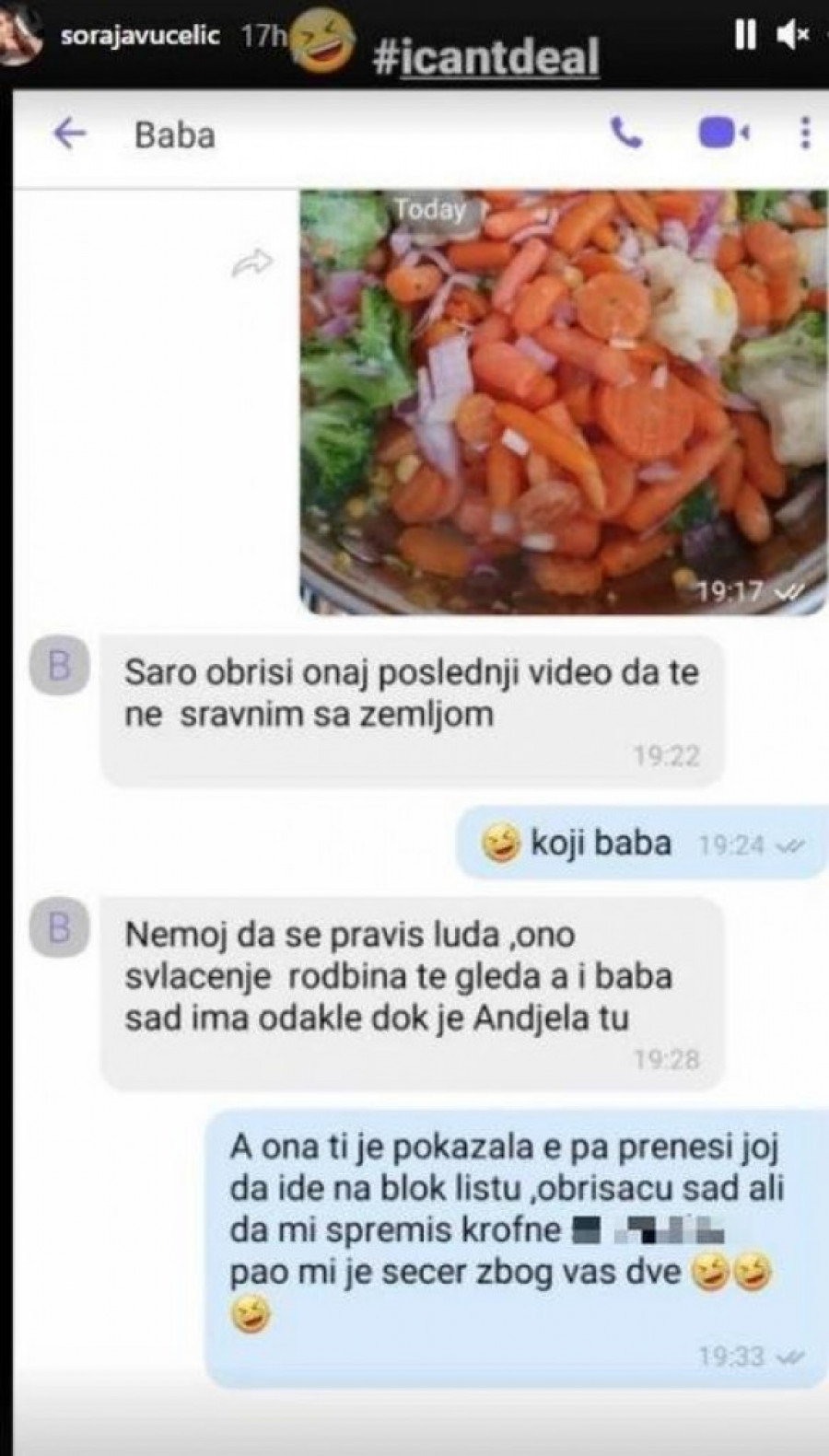 - Saro, obriši poslednji video da te ne sravnim sa zemljom... Nemoj da se praviš luda, ono svlačenje. Rodbina te gleda, a i baba ima odakle, sada je Anđela tu - napisala je baka.