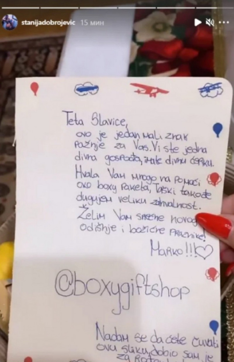 - Teta Slavice, ovo je jedan mali znak pažnje za vas. Vi ste jedna divna gospođa, imate divnu ćerku. Hvala vam mnogo na pomoći. Želim vam srećne praznike. Nadam se da ćete čuvati ovu sliku, dobio sam je za rođendan, Marko - piše u poruci koju je Marković poslao svojoj tašti.
