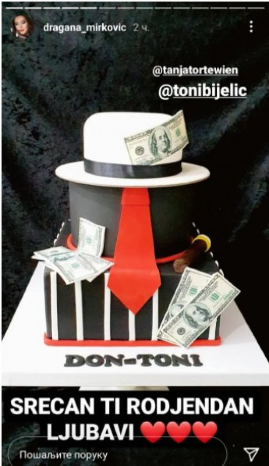 Ove godine ne slave u velikom krugu ljudi, zbog pandemije koronavirusa, što Draganu pak nije sprečilo da svom dragom poruči grandioznu rođendansku tortu, kako bi njegov divan dan bio potpun. Torta za Tonja ukrašena je veoma specifično, na njoj se nalazi beli šešir i novac, kao i tompus.