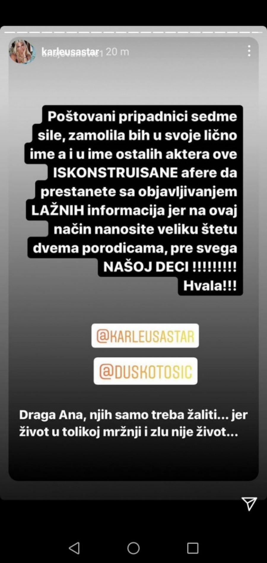 - Poštovani predstavnici sedme sile, zamolila bih u svoje lično ime a i u ime ostalih aktera ove iskonstruisane afere da prestanete sa objavljivanjem lažnim informacija jer na ovaj način nanosite veliku štetu dvema porodicama, pre svega našoj deci - prenala je Anim post Karleuša i na svoj Instagram stori.