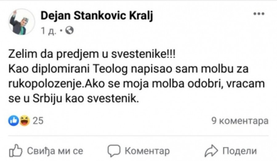 Naime on je napisao da sve poslove koje je do sada obavljao želi da ostavi iza sebe i da postane sveštenik.