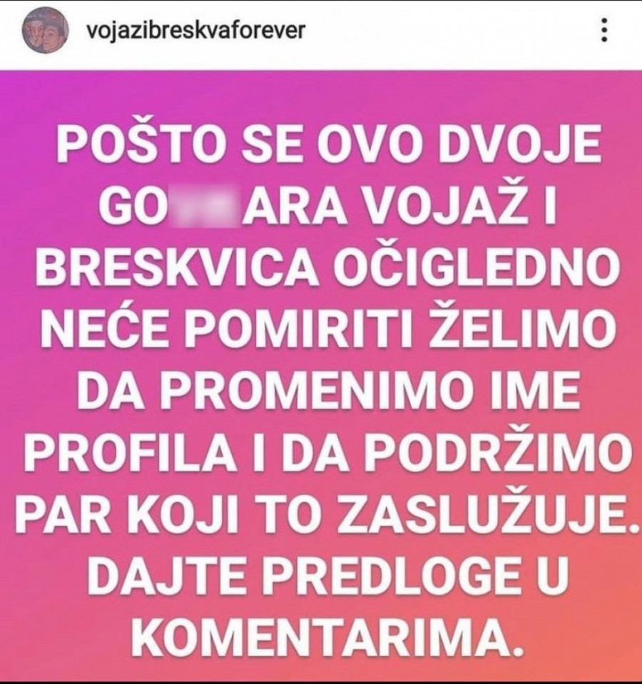 Foto: Printscreen- Pošto se ovo dvoje go**ara Vojaž i Breskvica očigledno neće pomiriti, želimo da promenimo ime profila i da podržimo par koji to sazlužuje - stoji u statusu.