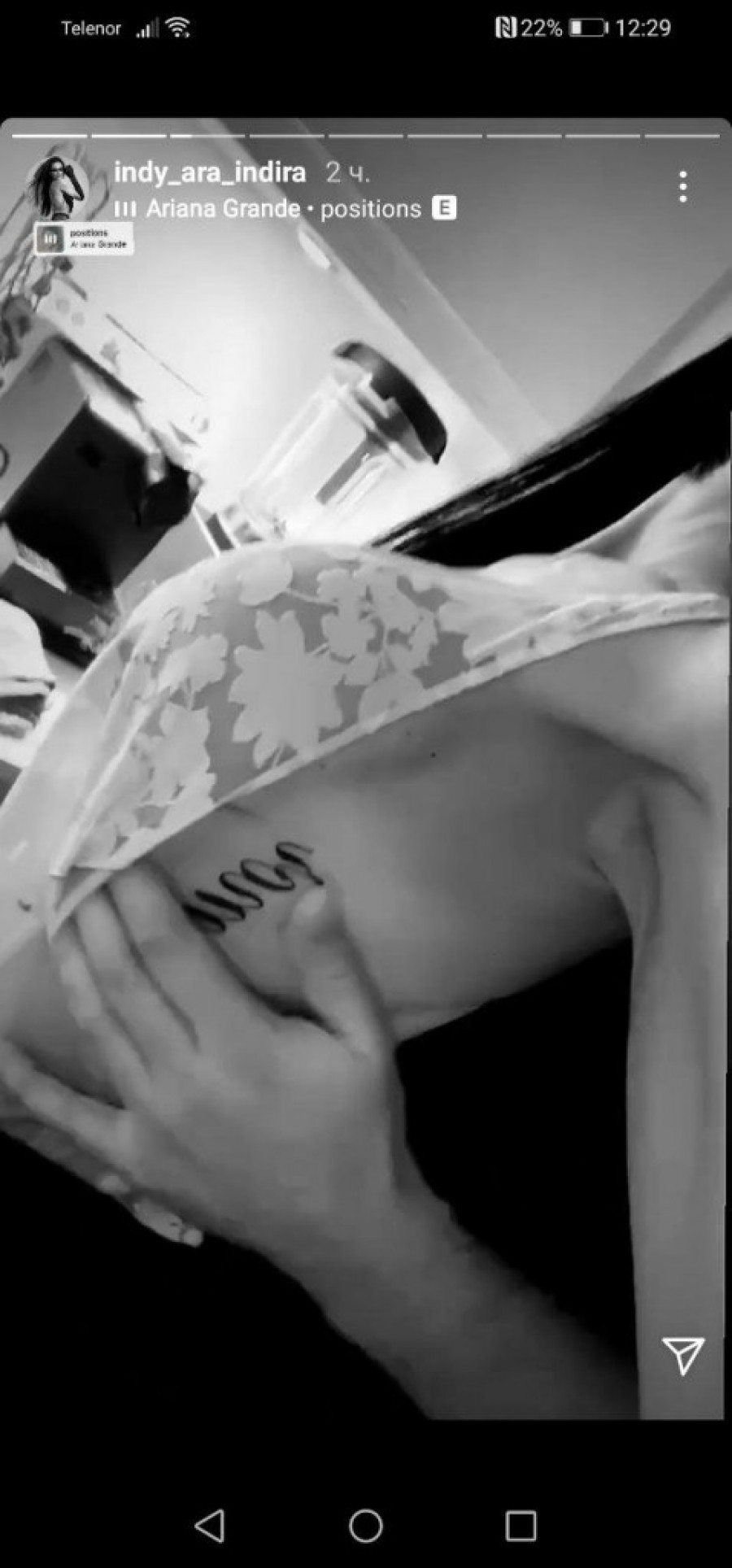 Indi je na Instagramu objavila video u kojem pozira u čipkanom bodiju, isečenom tako da otkriva "tet", ali izgleda ne dovoljno, pošto u sledećem trenutku vidimo mušku ruku koja je prvo mazi preko grudi, a onda i pomera bodi da se tetovaža bolje vidi!