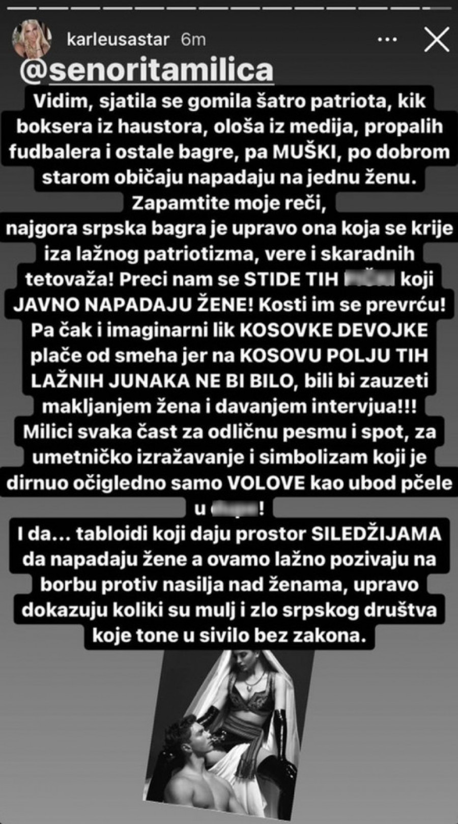 -Pa čak i imaginarni lik Kosovke devojke plače od smeha, jer na Kosovu Polju tih lažnih junaka ne bi bilo, oni bi bili zauzeti makljanjem žena i davanjem intervjua! Milici svaka čast za odličnu pesmu i spot, za umetničko izražavanje i simbolizam koji je dirnuo očigledno samo volove kao ubod pčele u du*e! - poručila je pevačica.