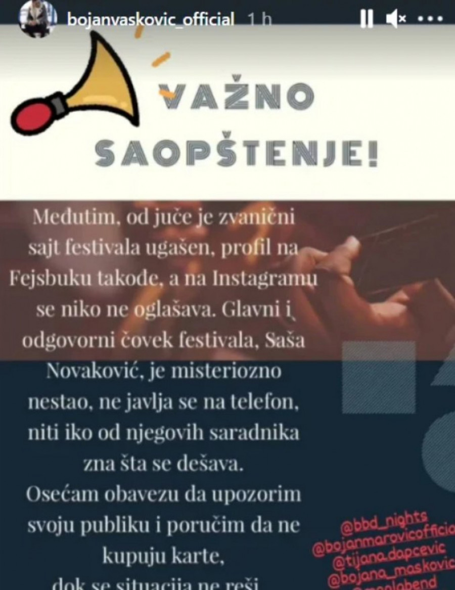 - Međutim, od juče je zvanični sajt festivala ugašen,profil na Fejsbuku takođe, a na Instagramu se niko ne oglašava. Glavni i odgovorni čovek festivala, Saša Novaković je misteriozno nestao, ne javlja se na telefon, niti iko od njegovih saradnika zna šta se dešava. Osećam obavezu da upozorim svoju publiku i poručim da ne kupuju karte, dok se situacija ne reši. Šta god bilo, muzika će spasiti sve(t), a ljudi koji se igraju tuđim vremenom i novcem će nadam se odgovarati za to - stoji na profilu frontmena Leksington benda Bojana Vaskovića, koji je pored Tijane Dapčević, Tropiko benda, Magla benda, Bojana Marovića i brojnih drugih izvođača bio angažovan na ovom projektu.