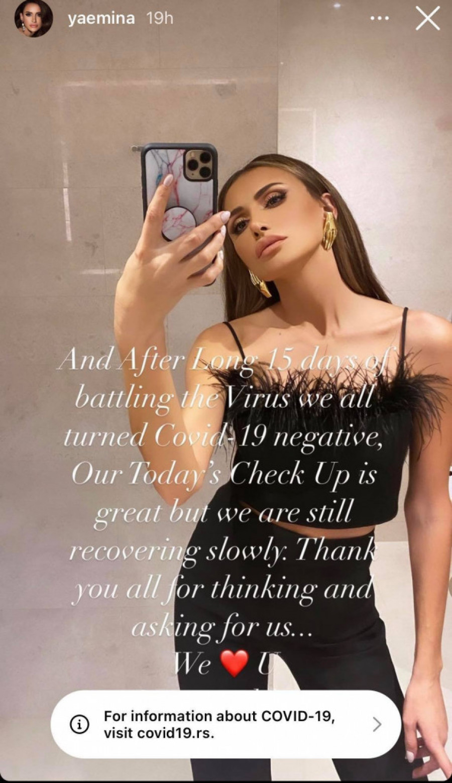 Foto: instagram.com/yaeminaNakon što je sve prošlo i pošto su pevačica i njena deca dobili negativne rezultate testa na Covid 19, Emina se oglasila i zahvalila svima na podršci: