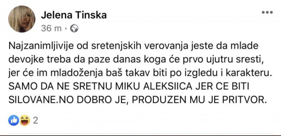 - Najzanimljivije od sretenjskih verovanja jeste da mlade devojke treba da paze danas koga će prvo ujutru sresti, jer će im mladoženja baš takav biti po izgledu i karakteru. Samod a ne sretnu Miku Aleksića jer će biti silovane. No dobro je, produžen mu je pritvor - napisala je Jelena koja je nedavno negativno komentarisala devojke koje su bivšeg profesora glume prijavile za seksualno zlostavljanje i uznemiravanje: