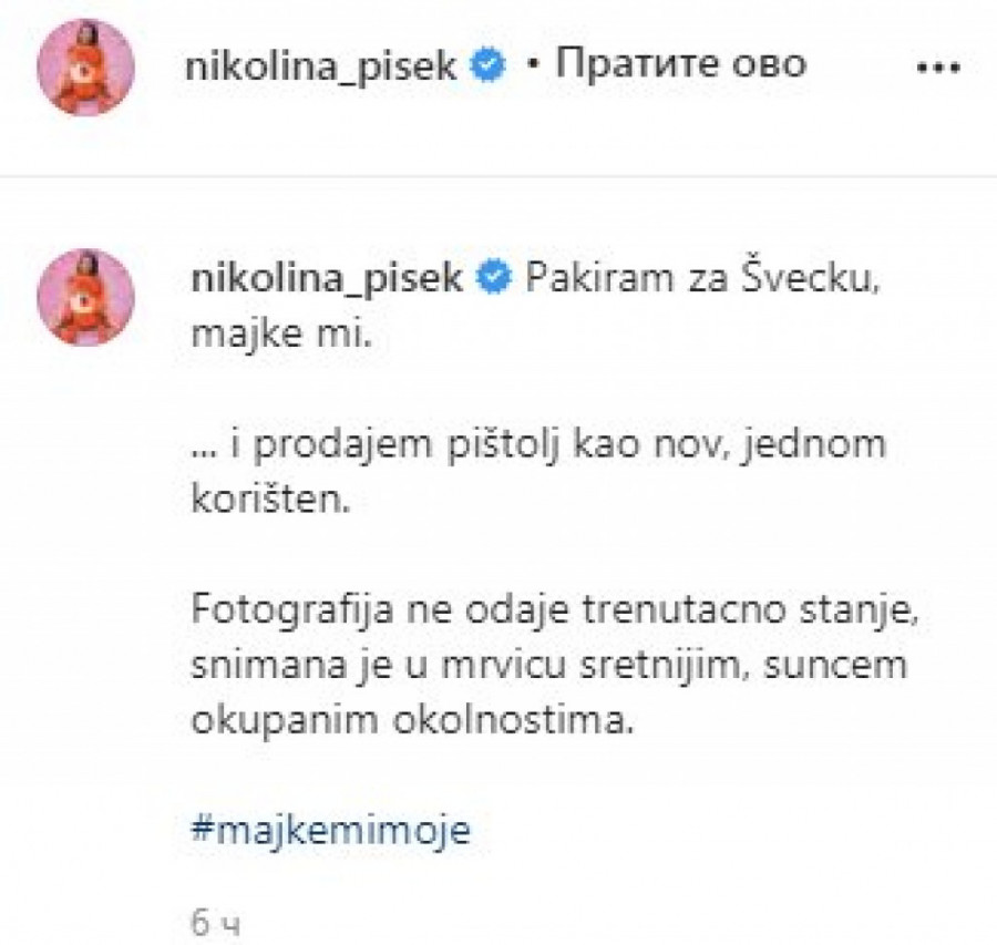 Foto: instagram.com/nikolina_pisekMeđutim, sadaje otkrila da će poprilično promeniti život te priznala da ima pištolj koji želi da proda, kao ida se seli u Švedsku: