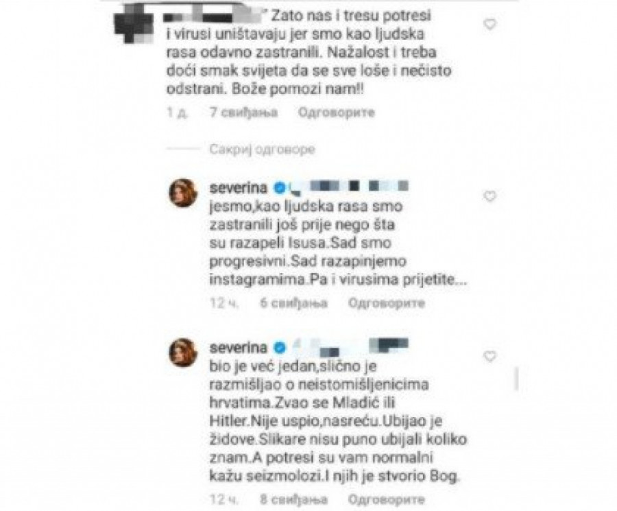 - Jesmo, kao ljudska rasa smo zastranili još pre nego što su razapeli Isusa. Sad smo progresivni. Sad razapinjemo Instagramima. Pa i virusima pretite. Bio je već jedan, slično je razmišljao o neistomišljenicima Hrvatima. Zvao se Mladić ili Hitler. Nije uspeo, na sreću. Ubijao je Jevreje. Slikare nisu puno ubijali, koliko znam. A potresi su vam normalni, kažu seizmolozi - šokirala je Severina.