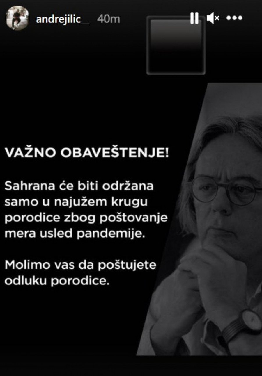 - Važno obaveštenje! Sahrana će biti održana samo u najužem krugu porodice zbog poštovanja mera usled pandemije. Molimo vas da poštujete odluku porodice- napisao je Andrej.