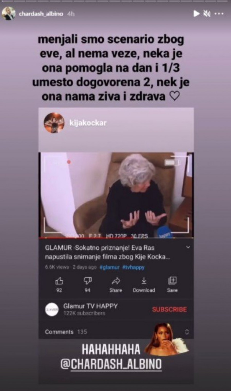 - Menjali smo scenario zbog Eve, ali nema veze, neka je ona pomogla na dan i 1/3 umesto dogovorena dva, nek je ona nama živa i zdrava - napisao je na Instagramu.