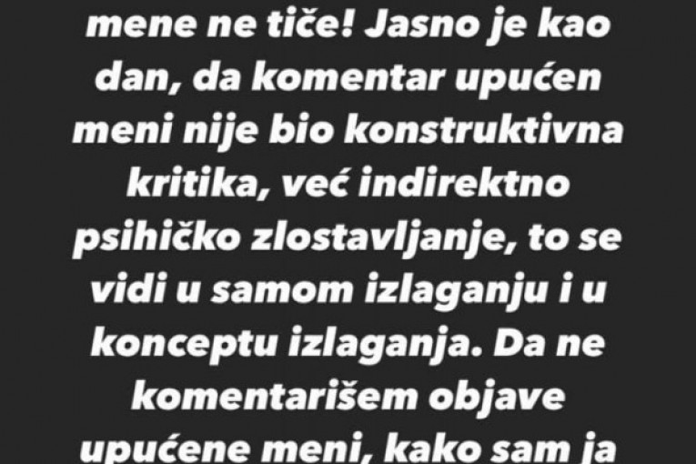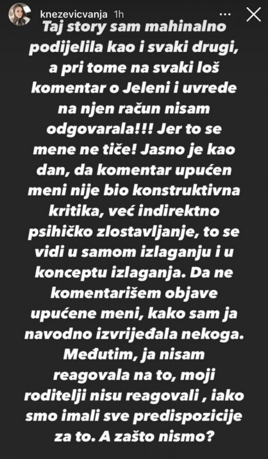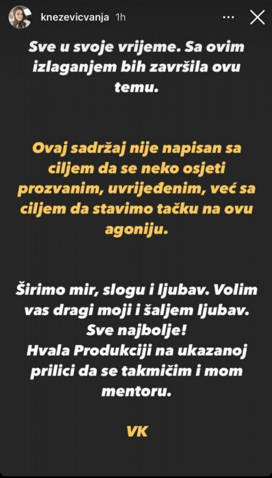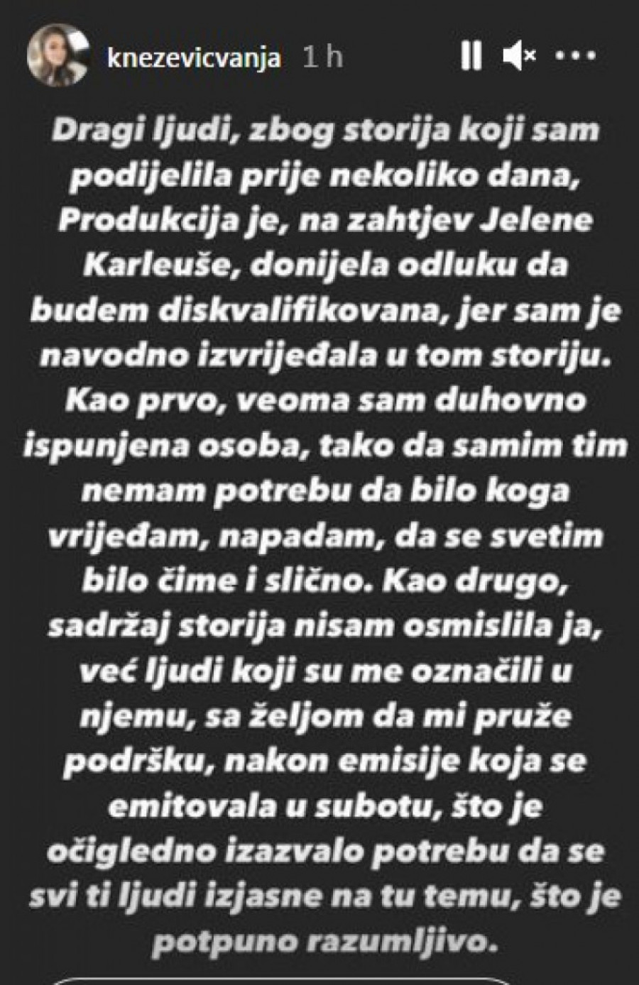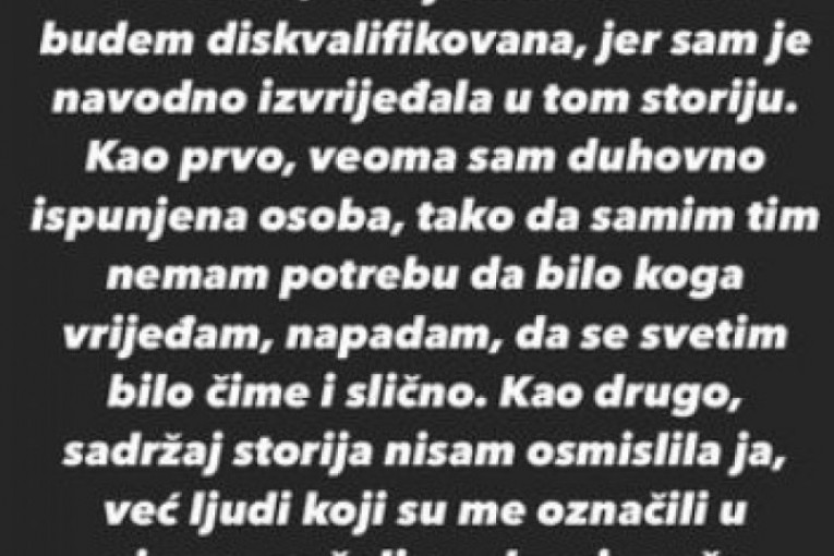 - Dragi ljudi, zbog storija koji sam podelila pre nekoliko dana, produkcija je, na zahtev Jelene Karleuše, donela odluku da budem diskvalifikovana, jer sam je navodno izvređala u tom storiju. Kao prvo, veoma sam duhovno ispunjena osoba, tako da samim tim nemam potrebu da bilo koga vređam, napdam, da se svetim bilo čime i slično. Kao drugo, sadržaj storija nisam osmislila ja, već ljudi koji su me označili u njemu sa željom da mi pruže podršku nakon emisije koja se emitovala u subotu, što je očigledno izazvalo potrebu da se svi ti ljudi izjasne na tu temu, što je potpuno razumljivo - napisala je, između ostalog, Vanja koja je dodala i da je njena jedina želja bila da učestvuje u ovom takmičenju, da peva i da se druži sa drugim kandidatima.