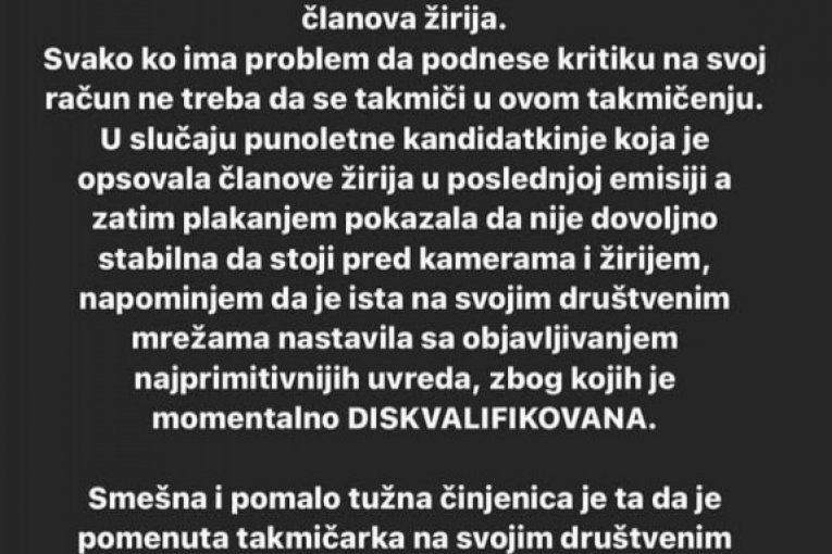 A Kneževićeva je večeras objavila da je diskvalifikona zbog obajava u kojima je zahvalila ljudima na podršci.