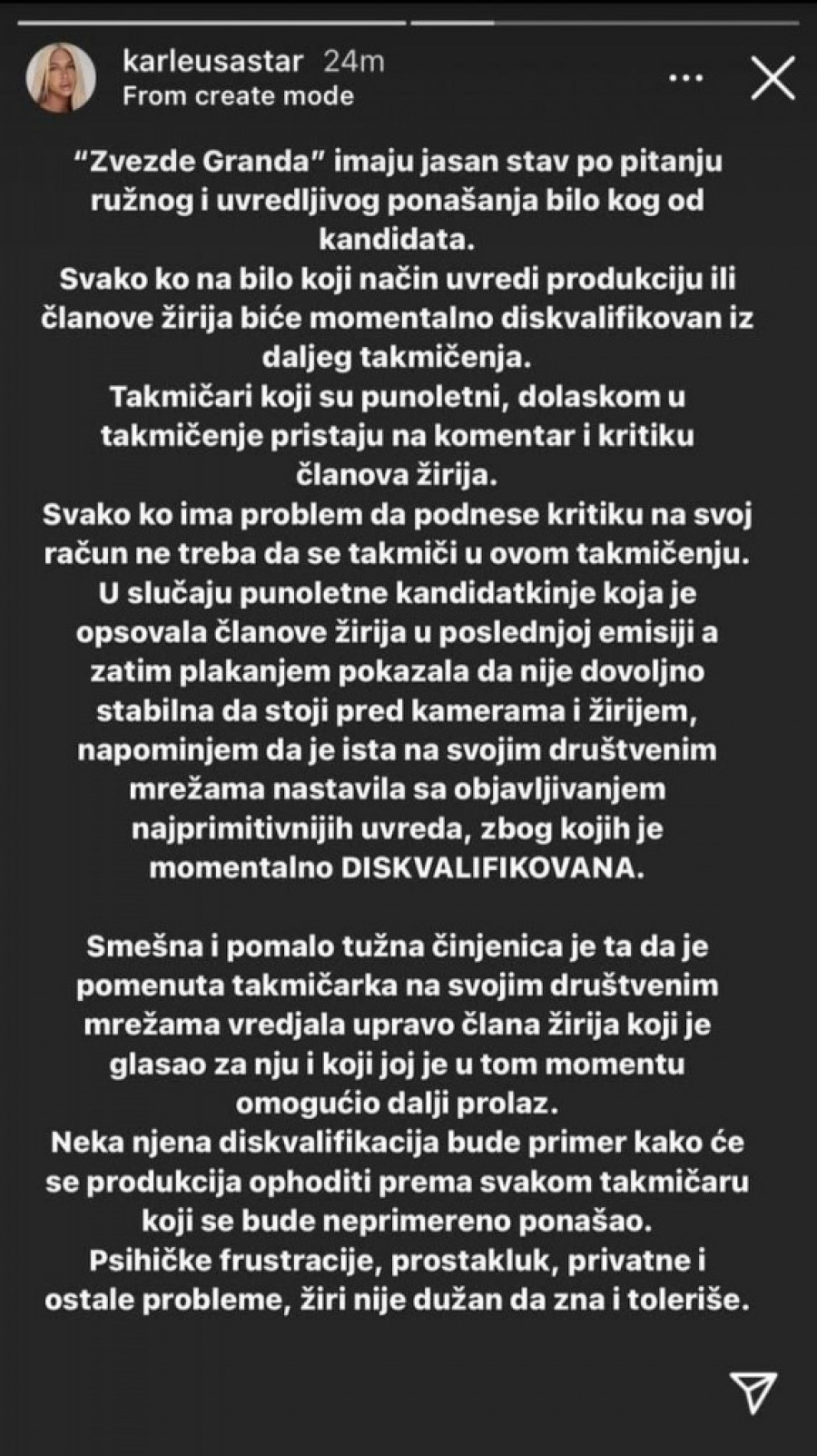 - Dragi ljudi, zbog storija koji sam podelila pre nekoliko dana, produkcija je, na zahtev Jelene Karleuše, donela odluku da budem diskvalifikovana, jer sam je navodno izvređala u tom storiju. Kao prvo, veoma sam duhovno ispunjena osoba, tako da samim tim nemam potrebu da bilo koga vređam, napdam, da se svetim bilo čime i slično. Kao drugo, sadržaj storija nisam osmislila ja, već ljudi koji su me označili u njemu sa željom da mi pruže podršku nakon emisije koja se emitovala u subotu, što je očigledno izazvalo potrebu da se svi ti ljudi izjasne na tu temu, što je potpuno razumljivo - napisala je, između ostalog, Vanja koja je dodala i da je njena jedina želja bila da učestvuje u ovom takmičenju, da peva i da se druži sa drugim kandidatima.
