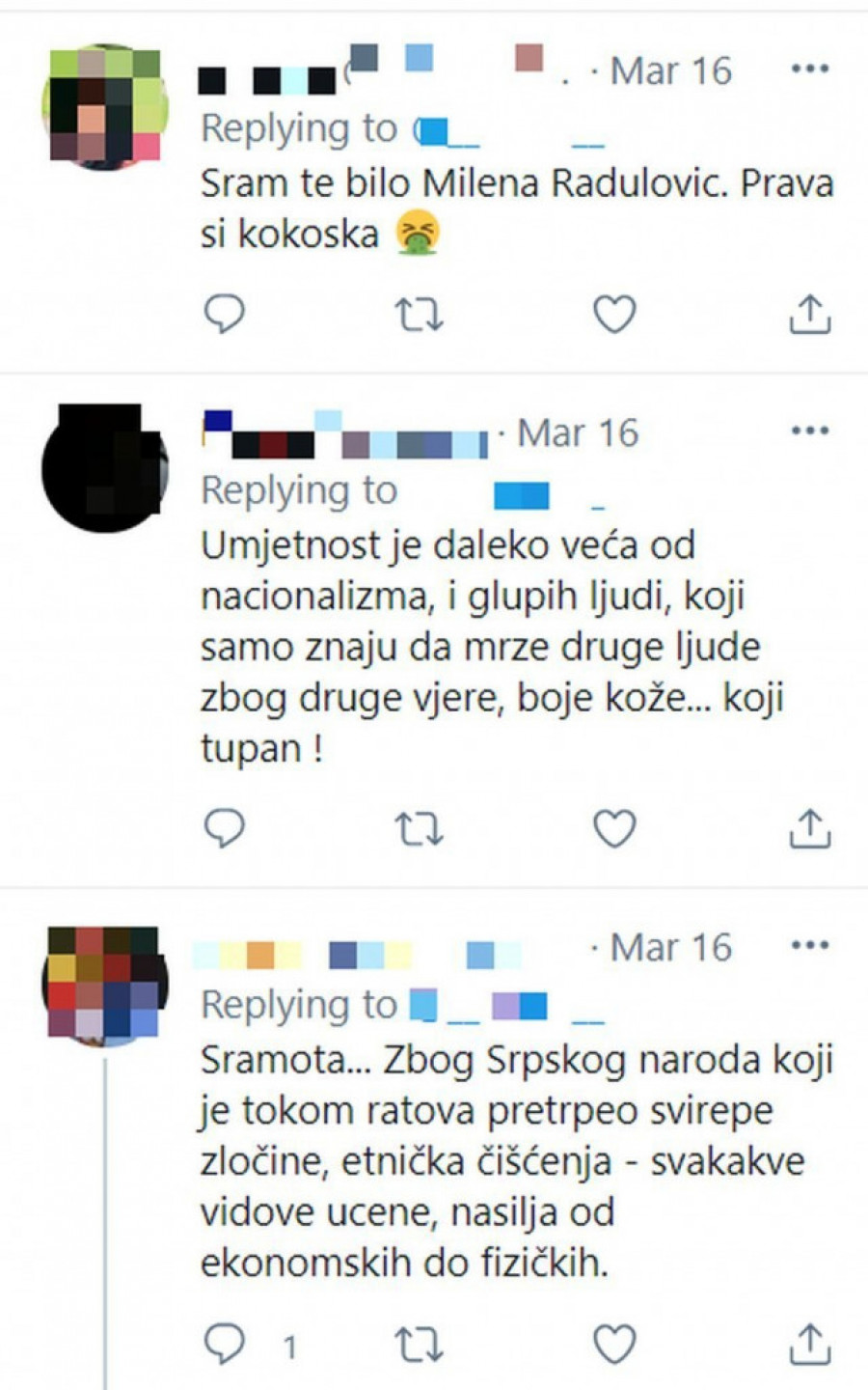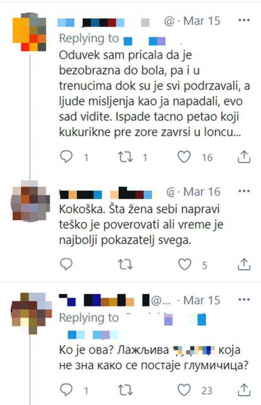 "Sram te bilo! Ovo je hvala celoj Srbiji koja je stala uz tebe" napisao je jedan tviteraš, a ispod su počele da se nižu i neumesni komentari. Većina nije mogla da veruje da je Radulovićka to uradila i prebacuju joj da je "izdala svoj narod".