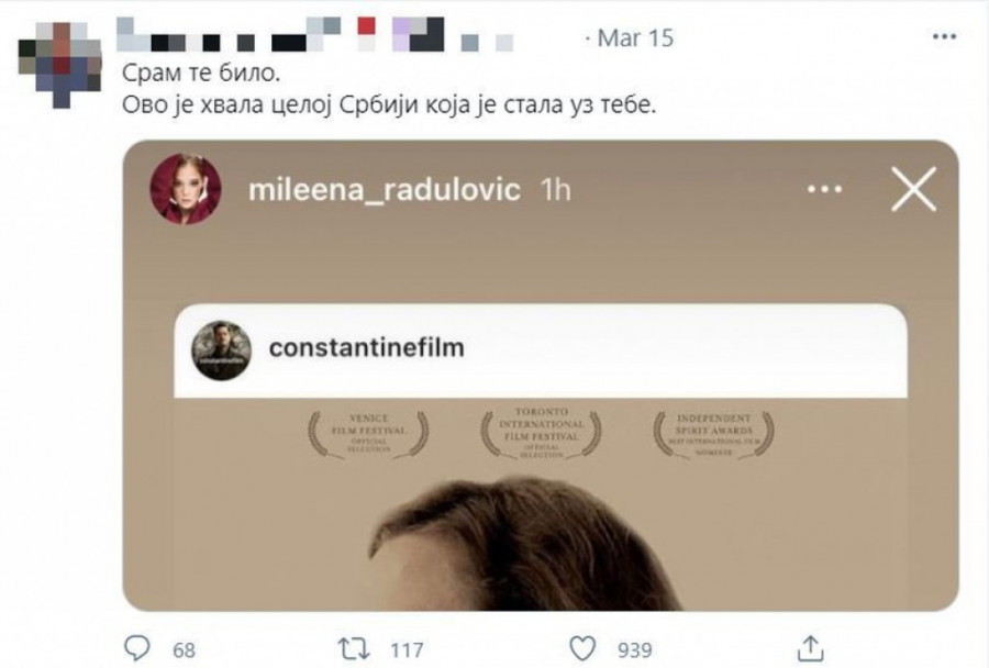 Podsetimo, kritički i uvredljivi komentari na Milenin račun počeli su nakon što je na svom Instagram storiju podelila plakat filma "Quo vadis, Aida". U ratnoj drami rediteljke Jasmile Žbanić igraju i dva srpska glumca, Boris Isaković i Jasna Đuričić.