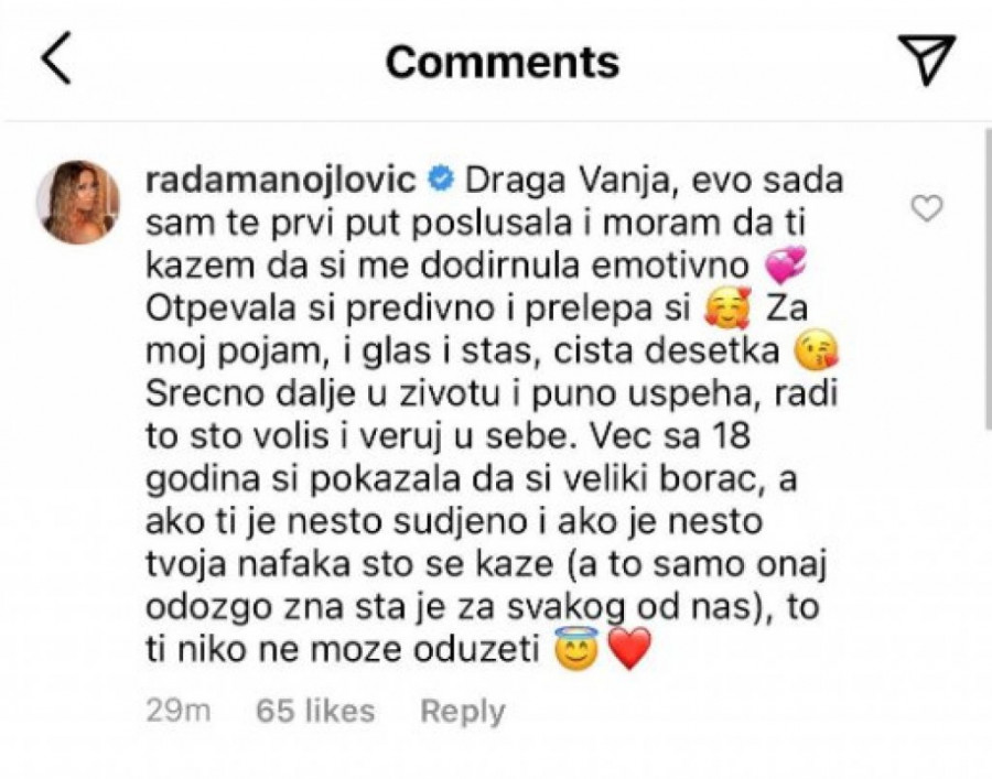 - Draga Vanja, evo sada sam te prvi put poslušala i moram da ti kažem da si me dodirnula emotivno. Otpevala si predivno i prelepa si. Za moj pojam, i glas i stas, čista desetka. Srećno dalje u životu i puno uspeha, radi to što voliš i veruj u sebe. Već sa 18 godina si pokazala da si veliki borac, a ako ti je nešto suđeno i ako je nešto tvoja nafaka što se kaže ( a to samo onaj odozgo zna šta je za svakog od nas), to ti niko ne može oduzeti - napisala je pevačica.