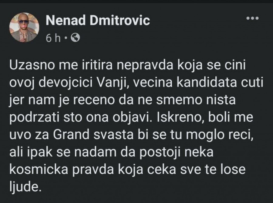- Užasno me iritira ova nepravda koja se čini ovoj devojci Vanji. Većina kandidata ćuti jer nam je rečeno da ne smemo ništa da podržimo što ona objavi. Iskreno, boli me uvo za "Grand", svašta bi se tu moglo reći, ali ipak se nadam da postoji neka kosmička pravda koja čeka sve te loše ljude - pisalo je.