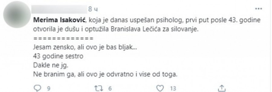 Foto: Printscreen/TwitterDugačak vremenski period za prijavu navodnog silovanja naišao je na osude na društvenim mrežama, gde su korisnici na mreži Tviter gnusnim komentarima iskazivali svoja mišljenja o navodima za silovanje Isakovićeve.