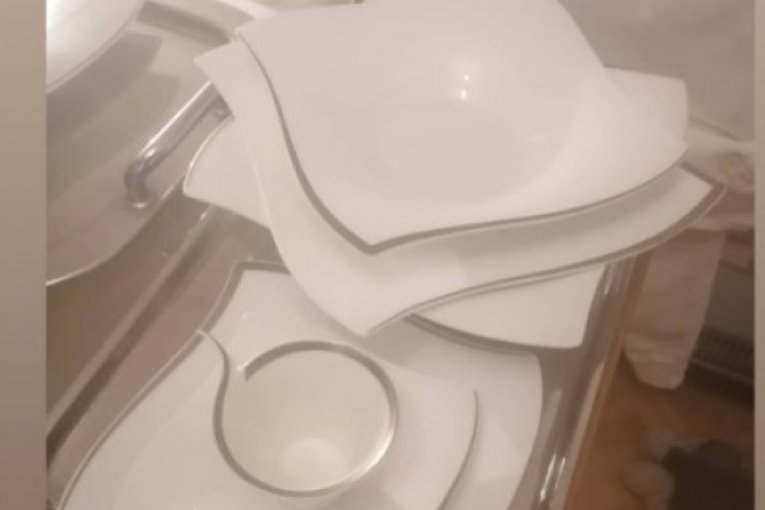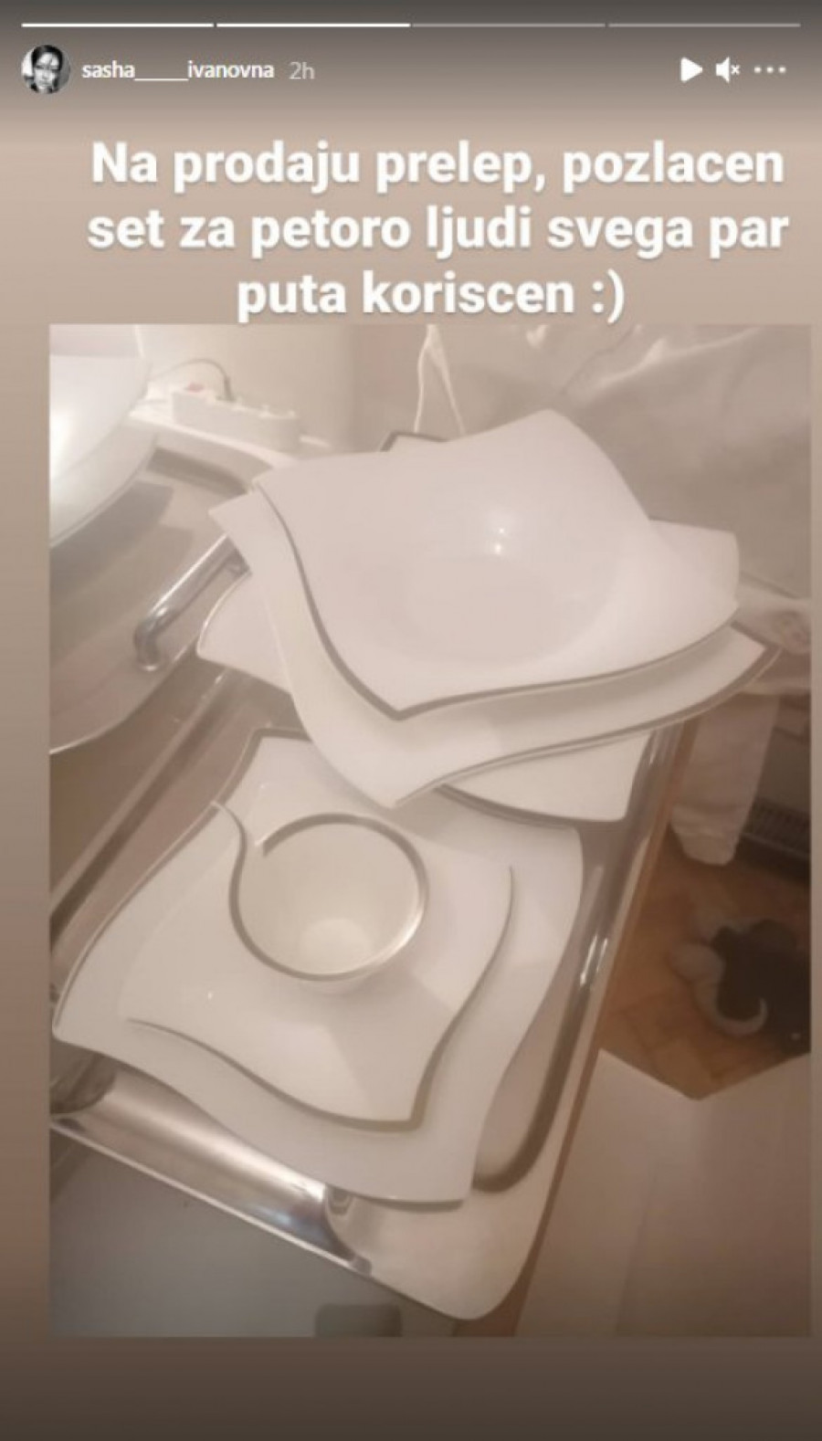 - Na prodaju prelep pozlaćen set za petoro ljudi, svega par puta korišćen - napisala je pevačica uz fotografiju belog seta posuđa, sa pozlaćenim ivicama.