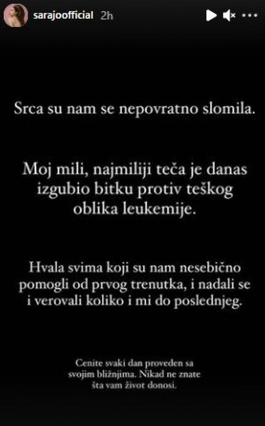 Foto: printscreen/instagram.com/sarajoofficial/- Srca su nam se nepovratno slomila. Moj mili najmiliji teča je danas izgubio bitku protiv teškog oblika leukemije. Hvala svima koji su nam nesebično pomogli od prvog trenutka i nadali se i verovali koliko i mi do poslednjeg. Cenite svaki dan proveden sa svojim bližnjima. Nikad ne znate šta vam život donosi - napisala je pevačica na Instagramu.