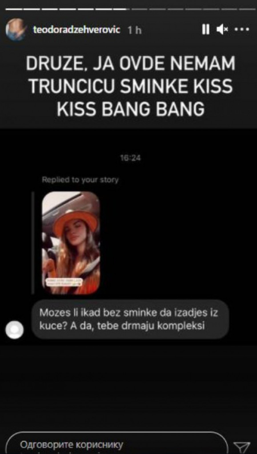 Foto: instagram.com/teodoradzehverovicKako piše u prepisci, njeni (anti)fanovi su je pitali kako nikada ne izlazi napolje bez šminke iako je kako ona kaže, baš na ovoj fotki bila bez šminke: