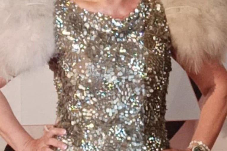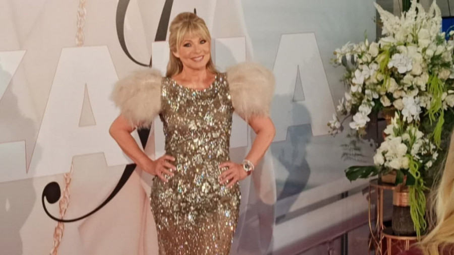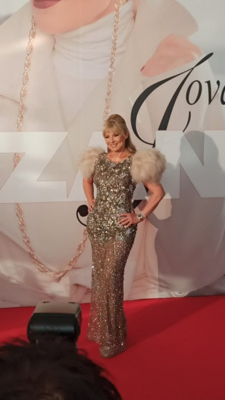 Pevačica za koju se priča da je, zahvaljujući prodaji Granda kojim je godinama rukovodio njen suprug Saša Popović, postala i najbogatija pevačica na estradi, pojavila se na promociji svog novog albuma obučena u svetlucavu, pripijenu haljinu s perjem na rukavima.