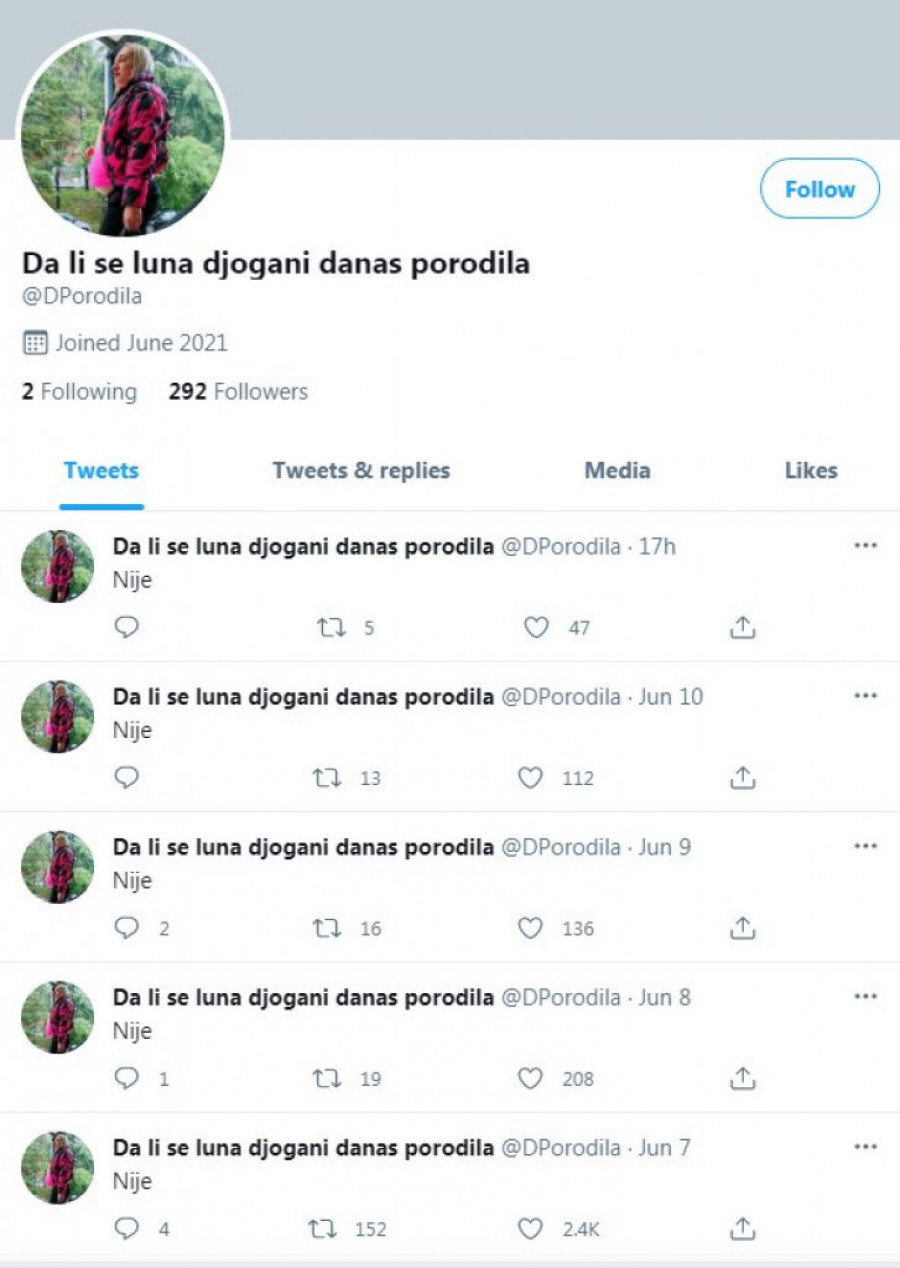Međutim, čini se da čekanje nikad da se završi, pa su sada već mnogi Lunini hejteri, a i fanovi, počeli da se šale na njen račun. Tako je nastao i tviter nalog ,,Da li se Luna Đogani danas porodila?", koji svakodnevno, od petog juna, kači odogovor na to pitanje koji glasi jeddnostavno: