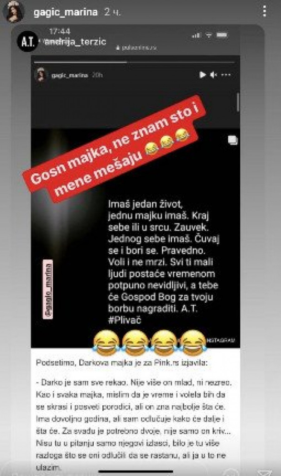 - Gosn majka, ne znam što i mene mešaju - poručila je Marina kao komentar na izjave Darkove majke.