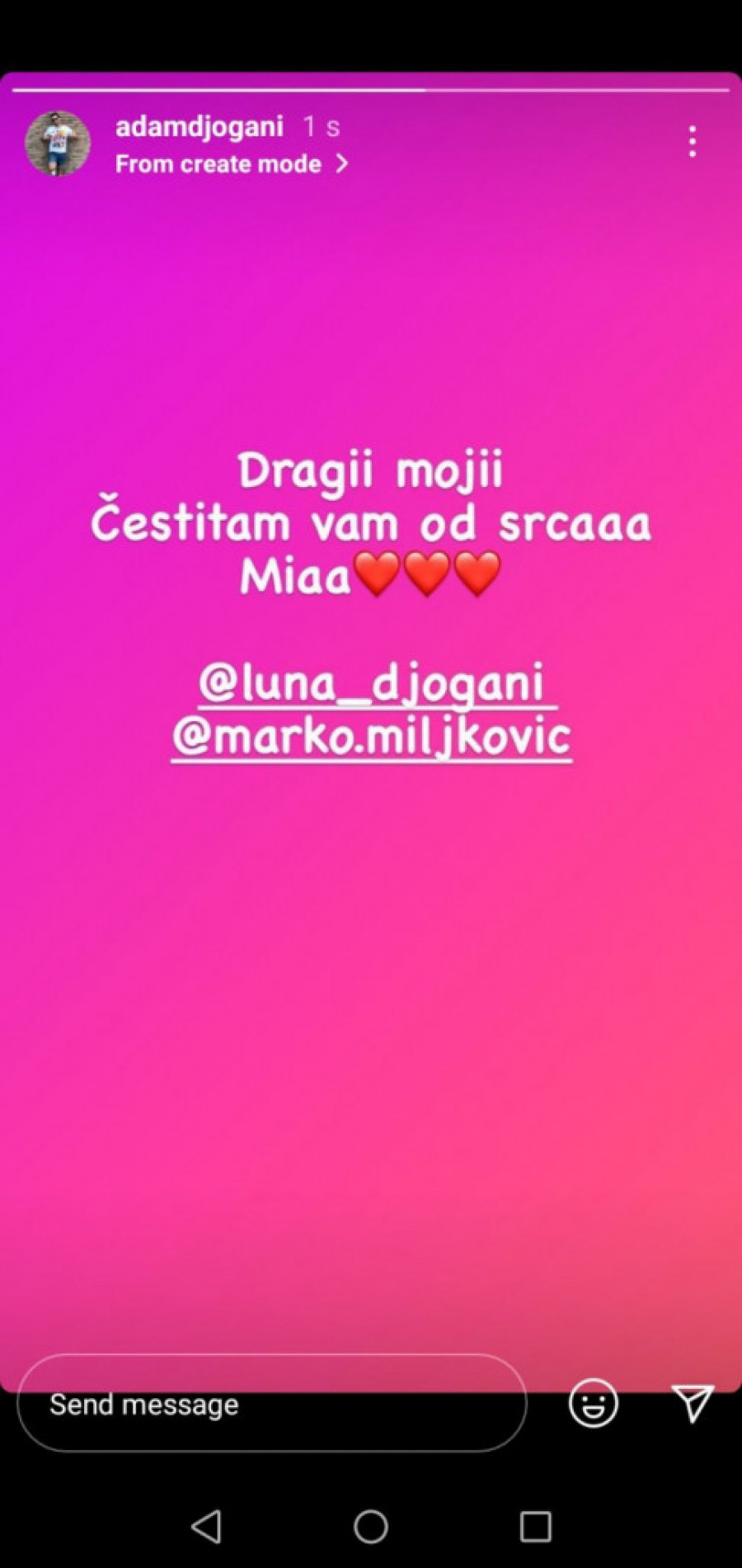 Foto: Printskrin: Instagram- Dragi moji, čestitam vam od srca- oglasio se i Adam Đogani, koji se vidno uzbuđen oglasio za naš portal i izjavio da ga je ova vest zatekla na mostu i da je presrećan.