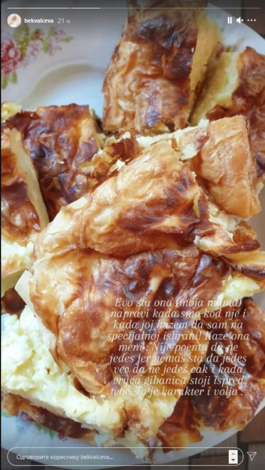 - Evo šta ona, moja mama, napravi kada smo kod nje i kada joj kažem da sam na specijalnoj ishrani! Kaže ona meni: "Nije poenta da ne jedeš kad nemaš šta da jedeš, već da ne jedeš čak i kada vruća gibanica stoji ispred tebe. to je karakter i volja" – napisala je Bekvalčeva uz fotografiju domaće gibanice.