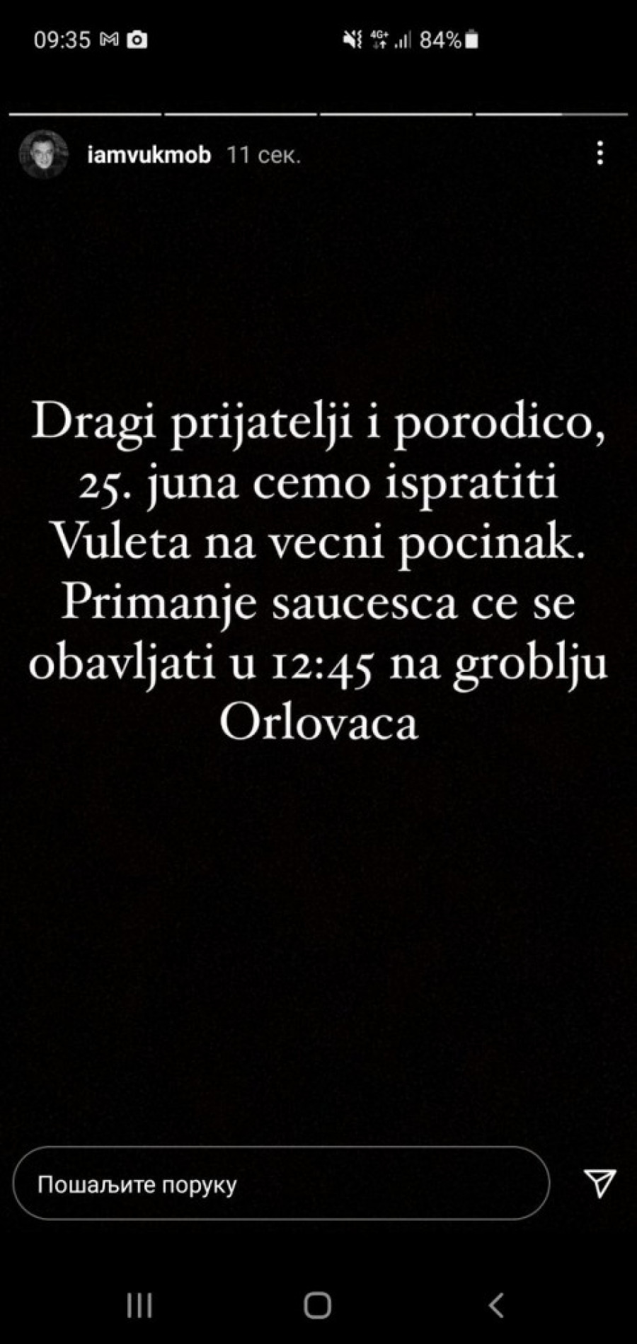 - Dragi prijatelji i porodico, 25. jula ćemo ispratiti Vuleta na večni počinak. Primanje saučešća će se obavljati u 12:45 na groblju Orlovača.
