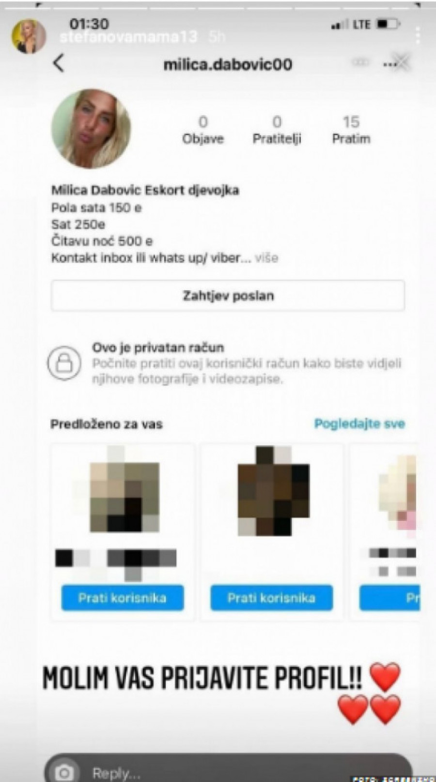 - Molim vas, prijavite profil! - pozvala je ona pratioce na Instagramu da reaguju zbog onoga što doživljava.