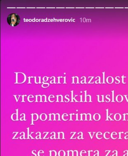 Naime, kako je bila uzbuđena što će se družiti sa publikom, Teodora je ovu lošu vest podelila na društvenoj mreži Instagram, te je kroz stori objasnila zbog čega je morala da donese ovakvu odluku.