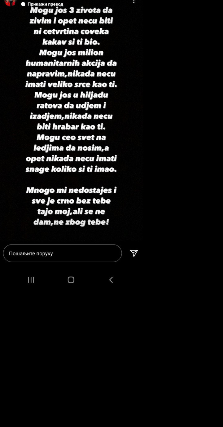 Foto: printscreen- Danas je mesec od kad je otišao moj heroj, moja snaga, moj Bog, moj idol. Sve što ja radim i što ću raditi je u tvoje ime, u tvoju čast i dok ja dišem, sa mnom dišeš i ti! Volim te zauvek!