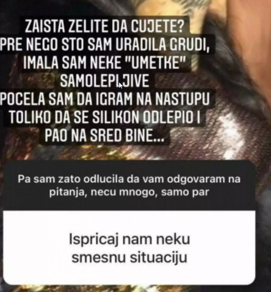 – Zaista želite da čujete? Pre nego što sam uradila grudi, imala sam neke „umetke“ samolepljive. Počela sam da igram na nastupu toliko da se silikon odlepio i pao nasred bine – napisala je Džehverovićeva.
