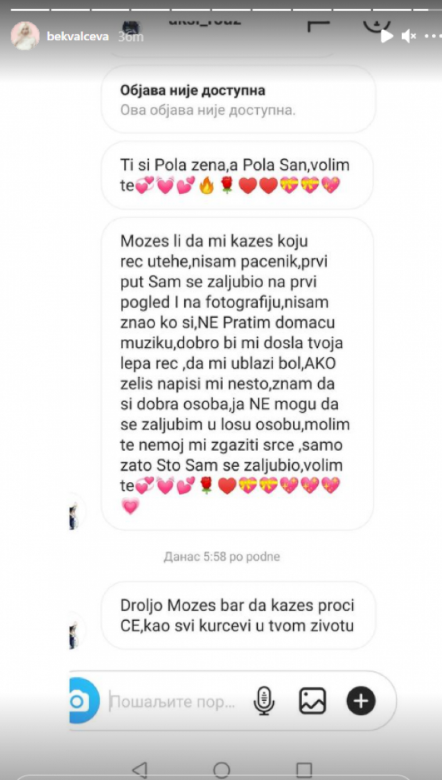 Naime, Nataša je na svoj instagram stori okačila sliku na kojoj se vidi kako joj nepoznati čovek šalje poruke da je voli, a kako mu pevačica nije odgovorila usledilo je vređanje.