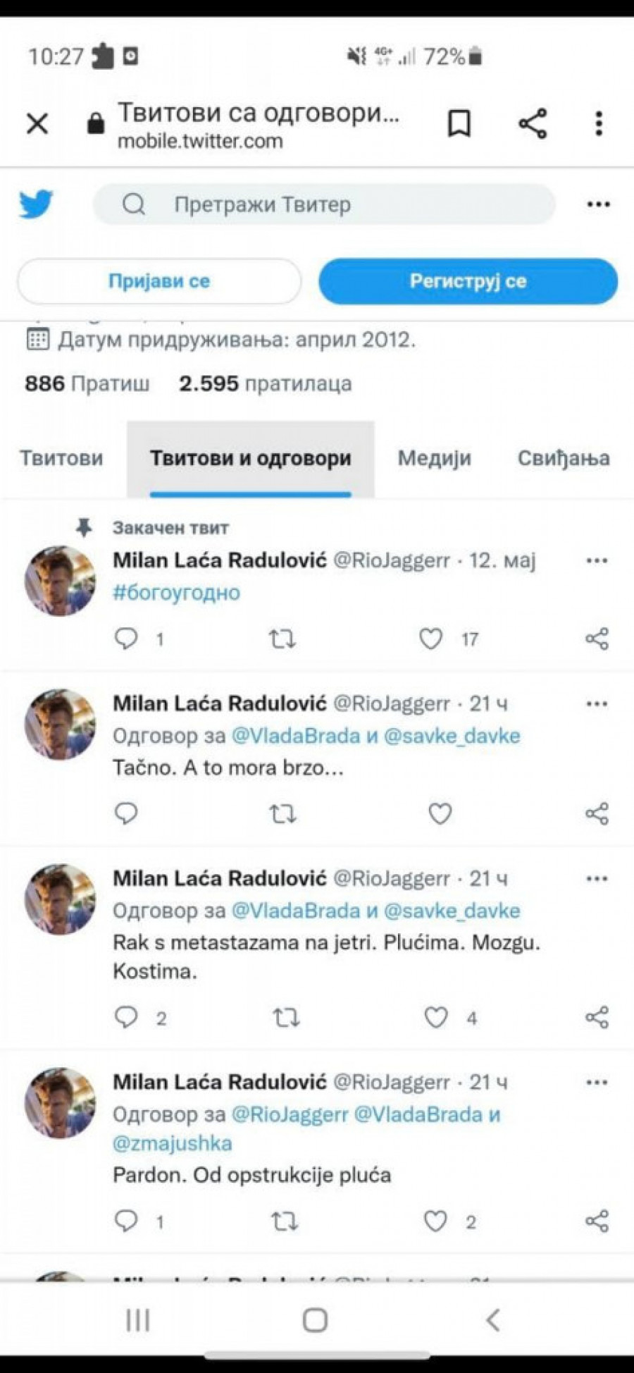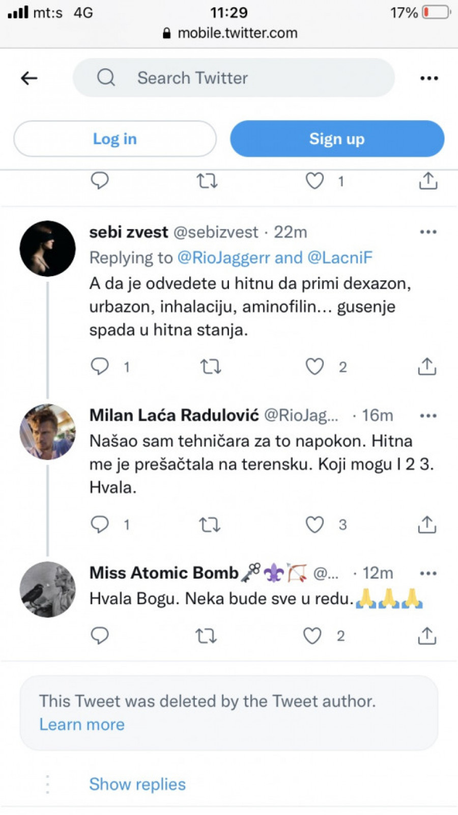 - Majka mi ima teška gušenja. Terenska služba može da dođe tek u 14 sati, što može biti kasno. U kovid legla ne želi da ide. Da li neko ima broj stručnog lica koje bi moglo da je pregleda što je pre moguće? Mi smo u Beogradu, na Vračaru - napisao je prestravljeni Milan i onda je pratiocima objasnio da je Marina teško bolesna: