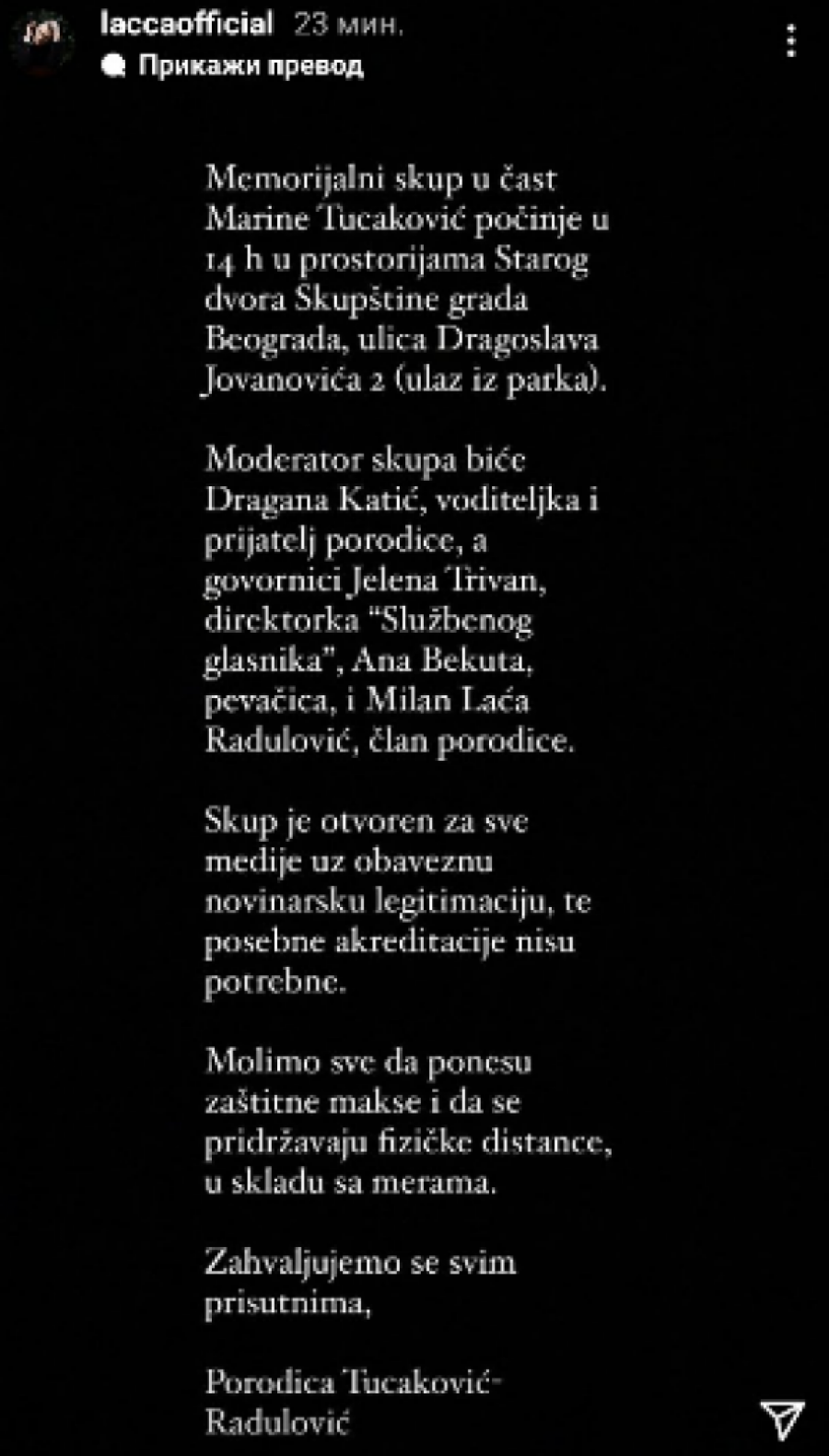 Laća Radulović je u objavi na društvenim mrežama saopštio datum i mesto komemoracije, ali je otkrio i ko će pričati ui čast njegove majke Marine Tucaković.