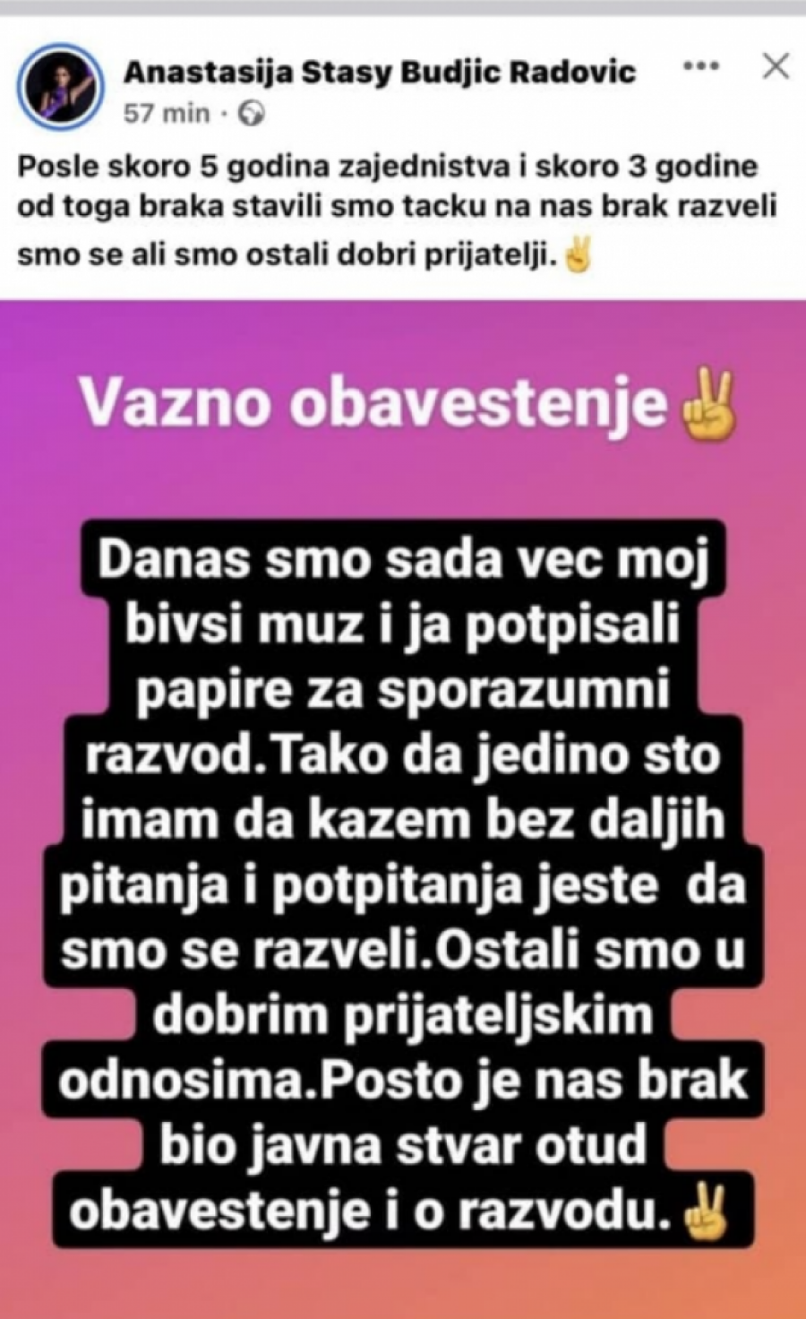 Naime, modelsica koja se klela na večnu ljubav, ipak je odlučila da stavi tačku na odnos sa Ivanom, te je u objavi na društvenim mrežama, obavestila javnost o razvodu.