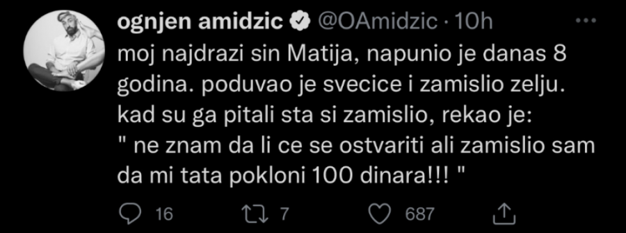 - Moj najdraži sin Matija, napunio je danas 8 godina. Poduvao je svećice i zamislio želju. Kad su ga pitali šta si zamislio, rekao je:" Ne znam da li će se ostvariti, ali zamislio sam da mi tata pokloni 100 dinara "- napisao je Ognjen.
