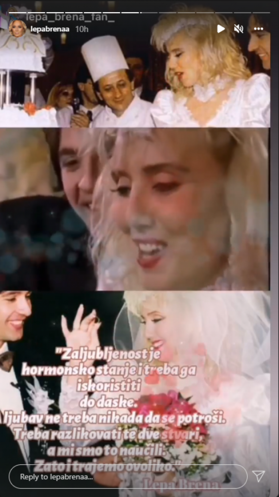 - Zaljubljenost je hormonsko stanje i treba ga iskoristiti do daske. A ljubav ne treba nikada da se potroši. Treba razlikovati te dve stvari, a mi smo to naučili. Zato i trajemo ovoliko - napisala je Lepa Brena u jednom od svojih storija.