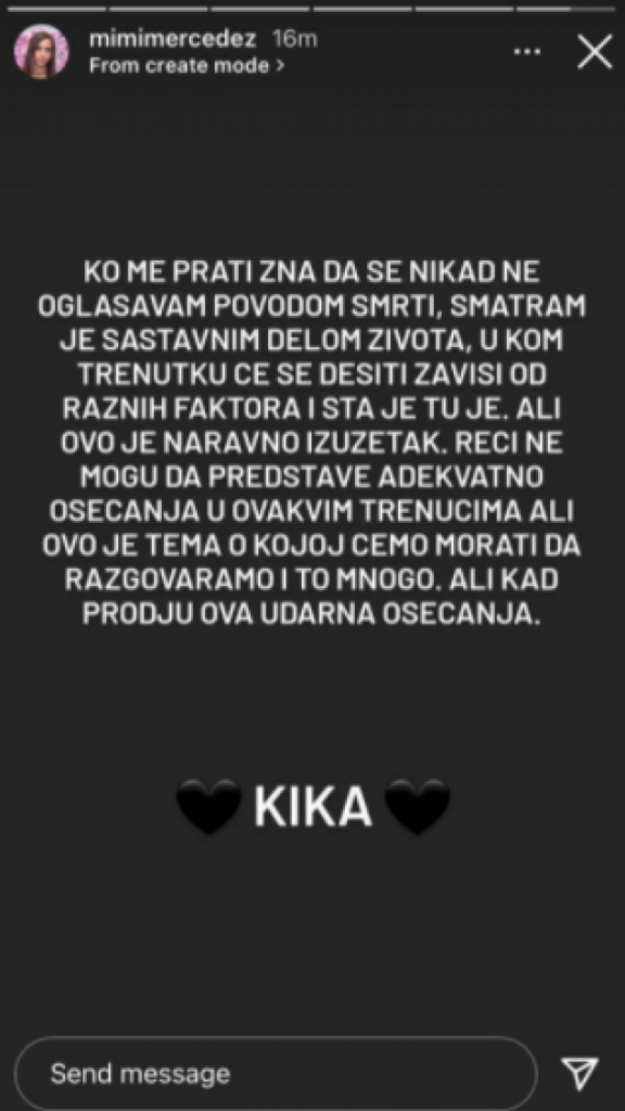 Mnogobrojne poznate ličnosti su se oprostile od tragično nastradale jutjuberke, a jedna od njih je i reperka Mimi Mercedez.