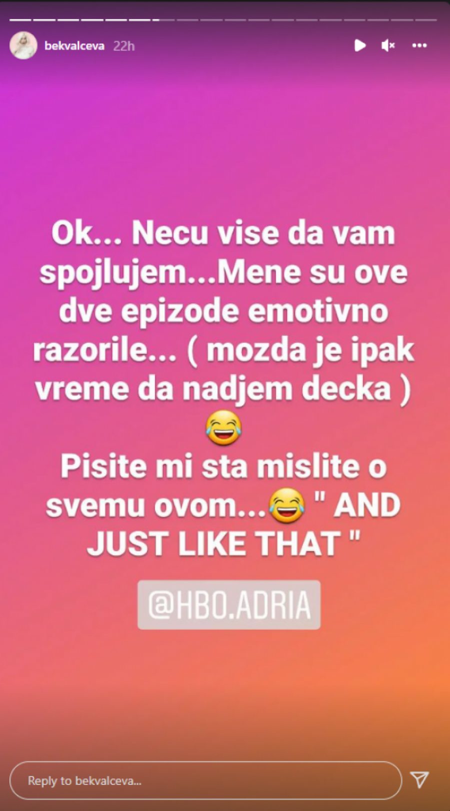 - Ok... Neću više da vam spojlujem... Mene su ove dve epizode emotivno razorile (možda je ipak vreme da nađem dečka). Pišite mi šta mislite o svemu ovom - napisala je Bekvalčeva na svom storiju.