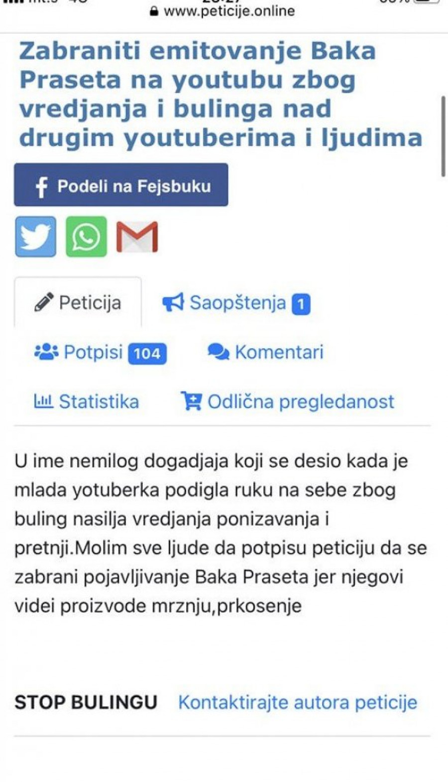 - U ime nemilog događaja koji se desio kada je mlada jutjuberka podigla ruku na sebe zbog nasilja, vređanja, ponižavanja i pretnji. Molim sve ljude da potpišu peticiju da se zabrani pojavljivanje Baka Praseta, jer njegovi videi proizvode mržnju, prkošenje.