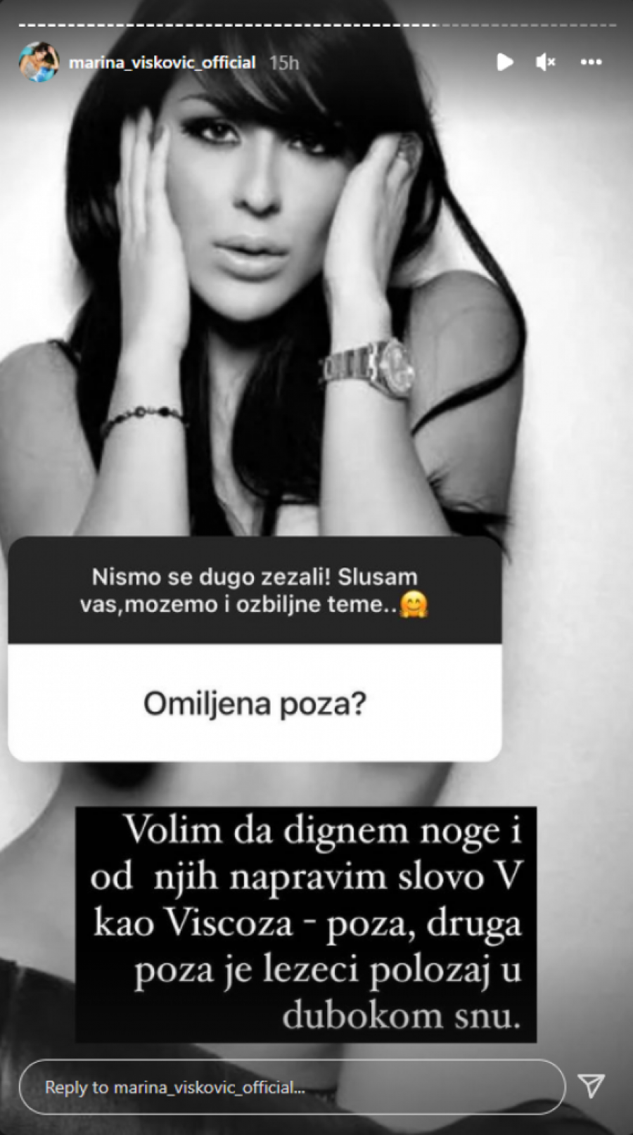 - Volim da dignem noge i od njih napravim slovo V kao Viscoza-poza, druga poza je ležeći položaj u dubokom snu - napisala je Marina i mnoge šokirala svojim odgovorom.